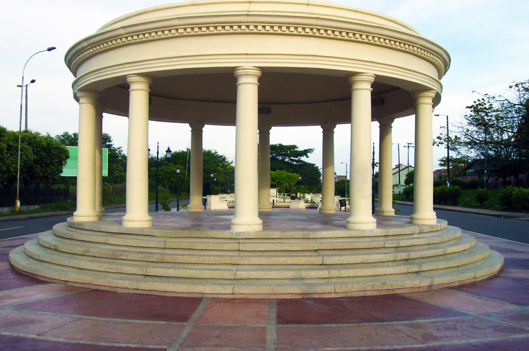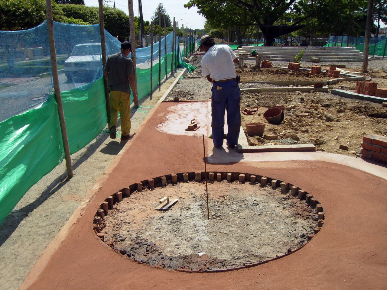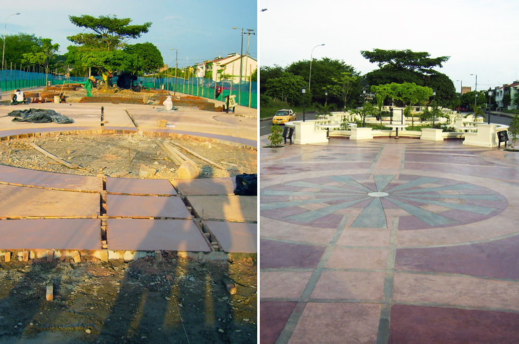 El parque de Barrancabermeja es un proyecto basado en concreto y la aplicación de endurecedores de colores, con una granulometría controlada y sello transparente para realzar y mantener el color sin que se vea afectado por los rayos uv.